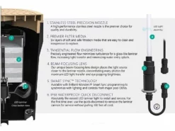 Our unique beam-focusing lens design places the light source closer to the laminar nozzle, concentrating every photon for maximum LED light transfer and eye popping brightness.