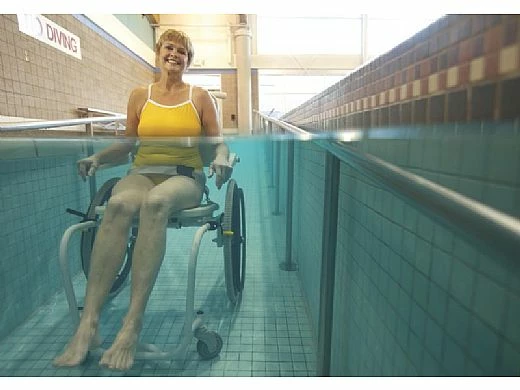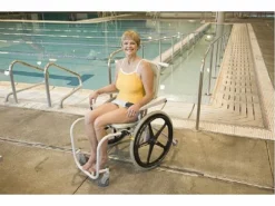 - Rear stabilizing wheels provide increased stability when the chair is in the water