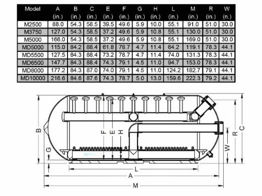 | Model | Valve Size (in) | Bed Depth (in) | Inner Dia. (in) | Filter Area (sq ft) | Flow Rates gpm/sq ft 5 10 15 20 | Media Volume (gallons) | Gravel 1.2-2.4 (lbs) | Sand 0.6-1.2 (lbs) | |||